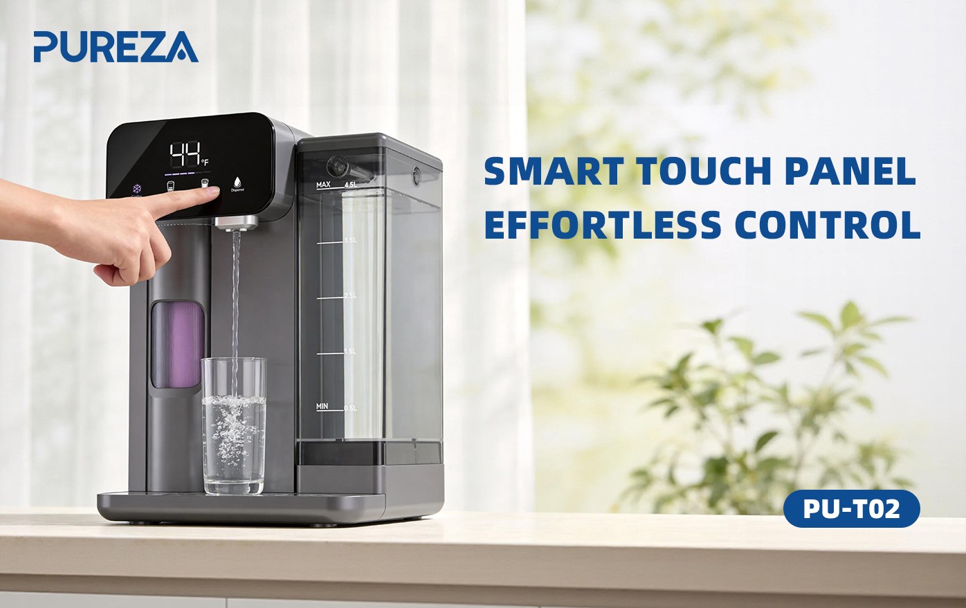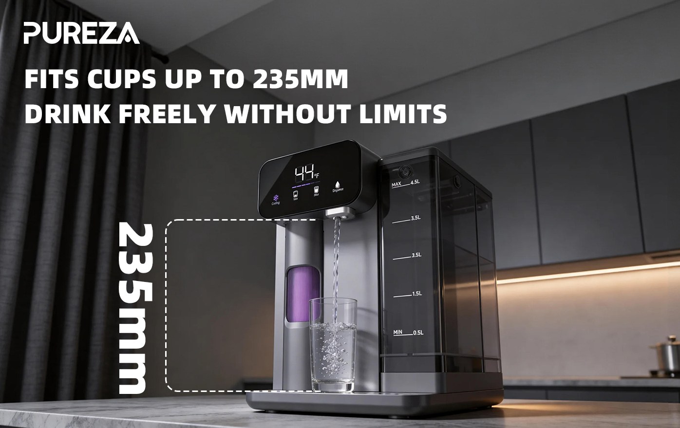 The PU-T02 countertop water purifier features a compact countertop design that fits cups up to 9.25 inches (235mm) tall, taking minimal space while remaining stylish and practical. It is plug-and-play, with a 4.5L water tank and a filter life of 1135L (approximately six months), reducing the hassle of frequent maintenance.